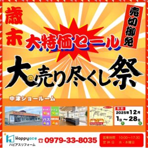 【中津市・豊前市・宇佐市・豊後高田市】ハピアスリフォーム12月開催リフォームイベント|歳末大特価セール★WEB限定大売り尽くし祭!