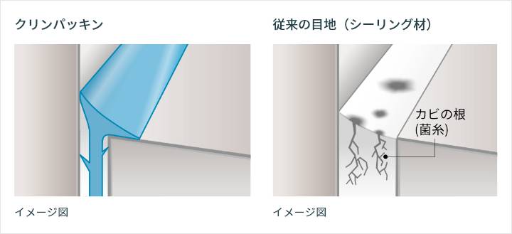 従来のシーリング材に比べて、カビの侵入に強い素材のパッキンを、浴室全体に採用しました。