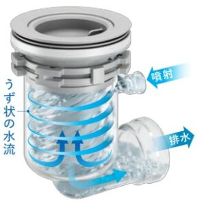 排水トラップ側面についた噴射口から水を噴射し、