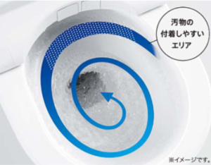 水が便器内をぐるっと回りながら、特に汚れが付きやすい後方部分に勢いよく当たります。