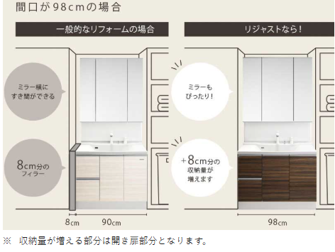 リジャストは間口調整に加えて、周辺収納やミラーキャビネットとの組み合わせ提案が可能です。