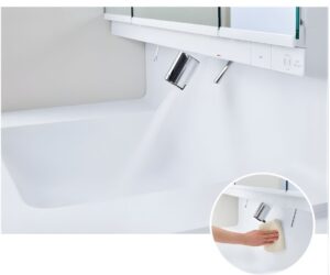 日常遣いに便利な、手を差し出すだけで 水が自動で出るタッチレス水栓も搭載。
