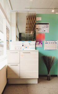クレヴィの隣には標準仕様の約800mmの洗面化粧台も展示しているので、実際に高さを比べることが可能です😊