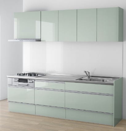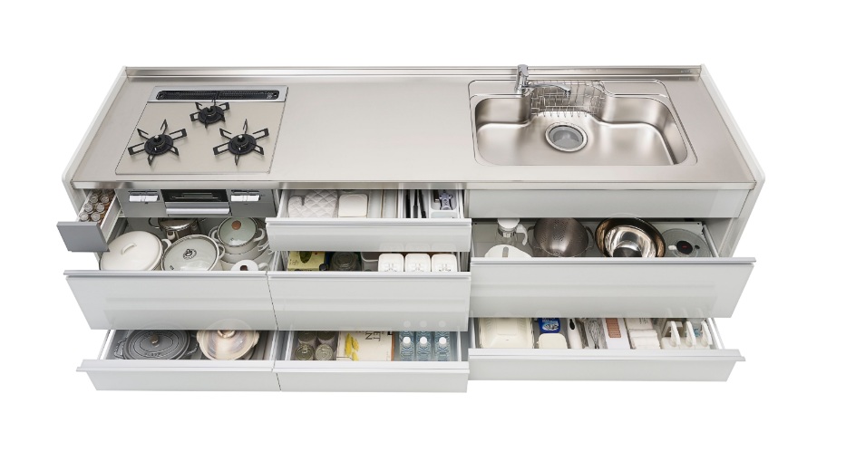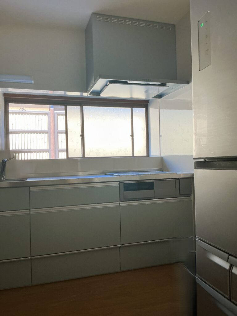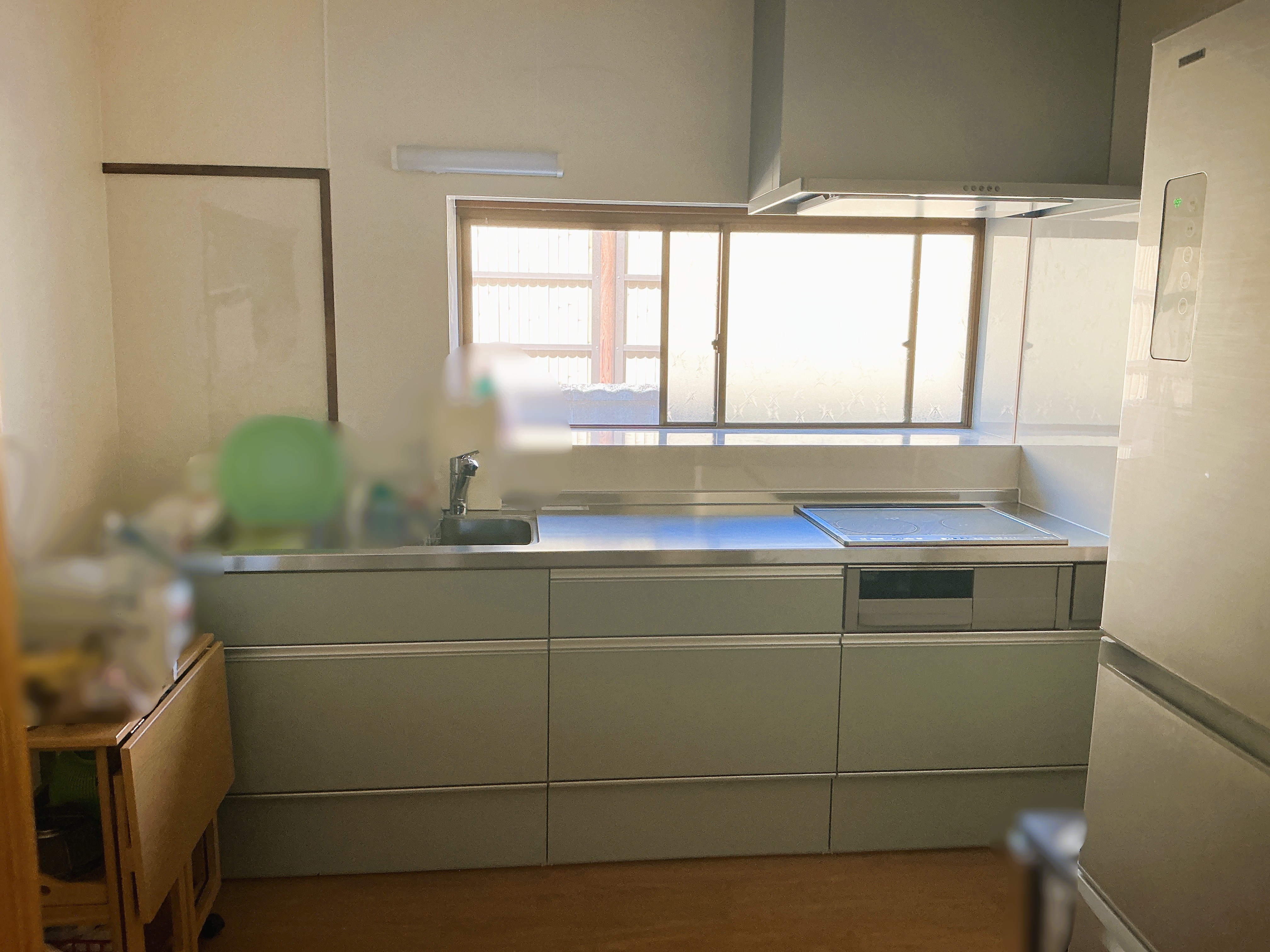 昔ながらの流し台から収納力のあるキッチンへアップグレード。キズが目立ちにくいコイニング加工のステンレスワークトップは、お掃除もしやすいです。長さも広くなった事で、作業スペースやシンクもゆったりと使えます。
