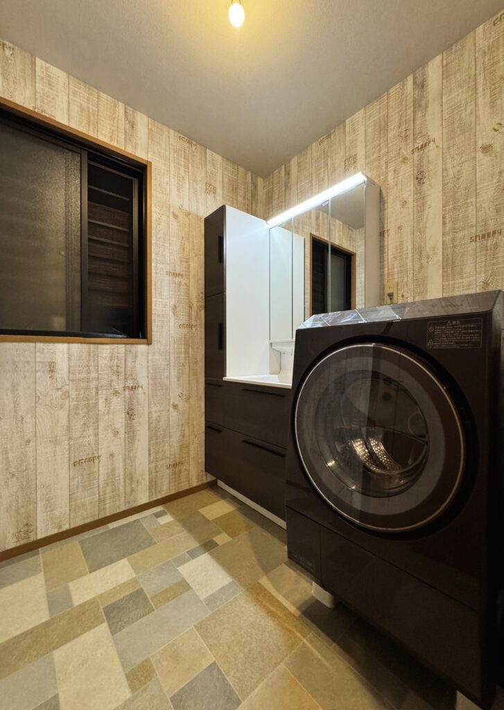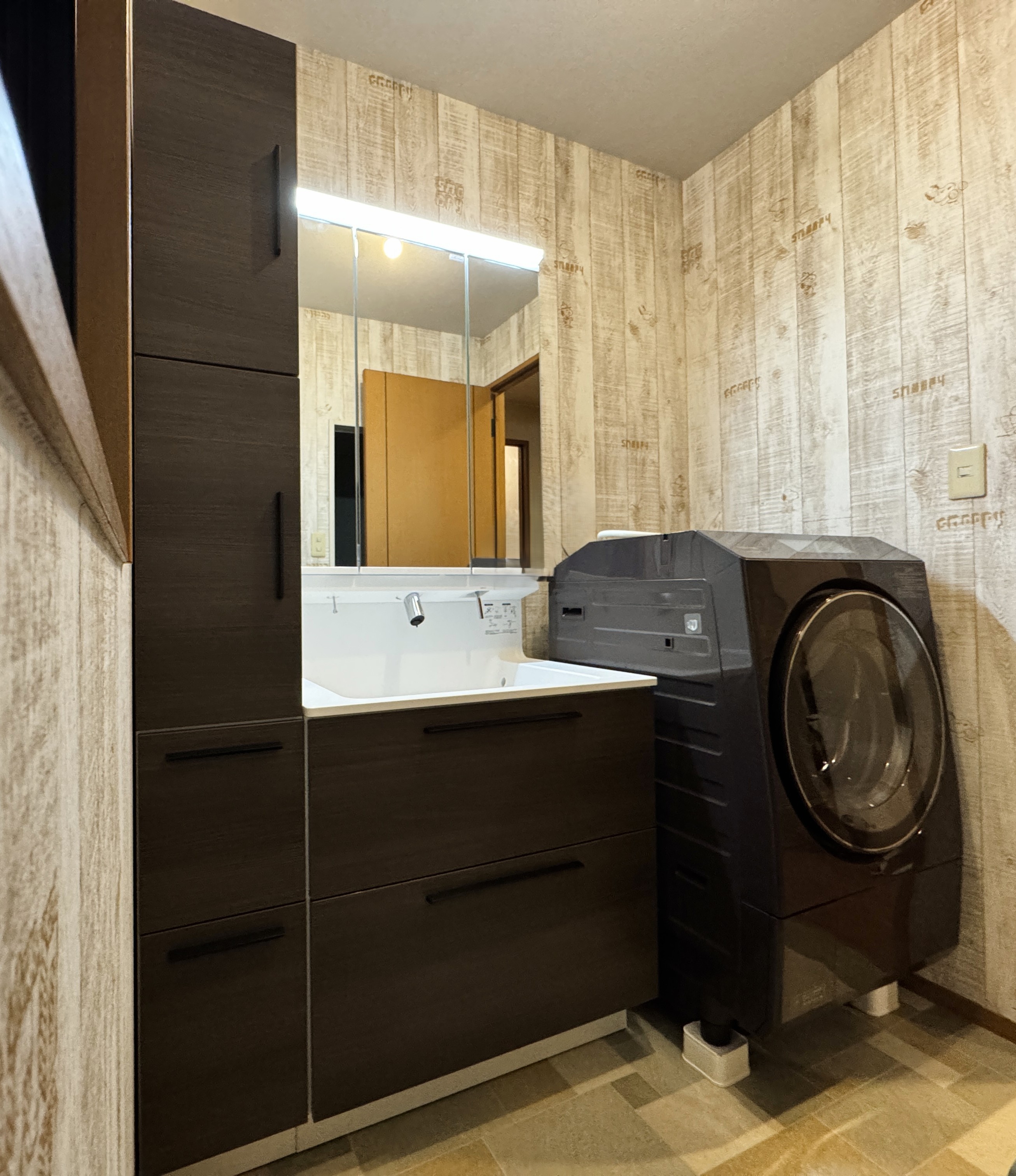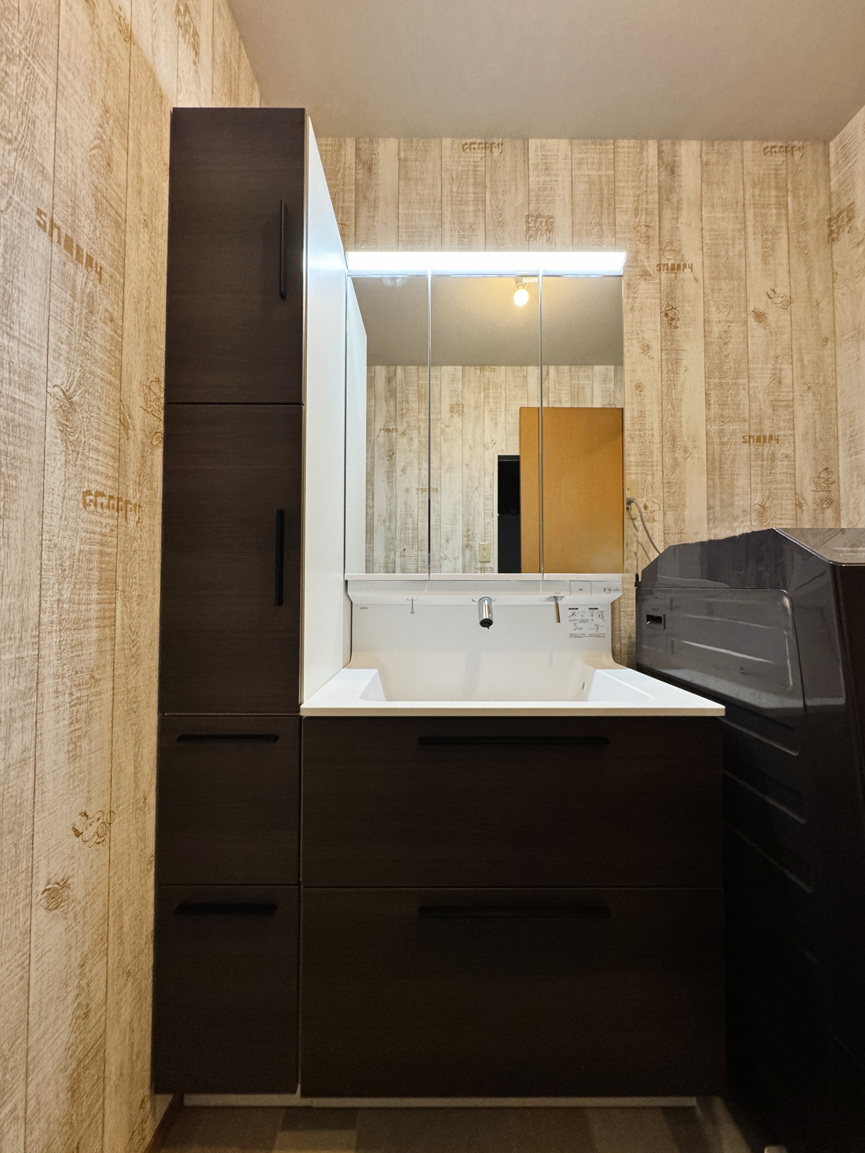 収納が狭く、生活感が出ていた洗面空間ですが、トールキャビネットを付ける事によって収納場所を確保。