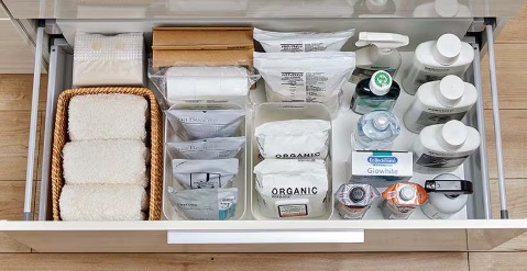 洗面空間で使用する小物類は上段、大きなストック品などは下段に分けてたっぷりしまえる大容量です。