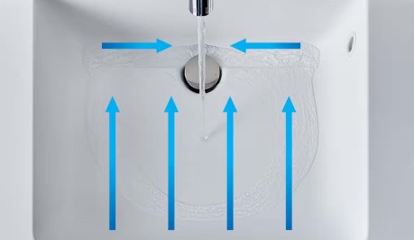 ボウル奥の段差に向かって、汚れやゴミをスムーズに洗い流せます。幅広の段差でとらえた水は、そのまま排水口へと流れ込んでいくボウルデザインです。